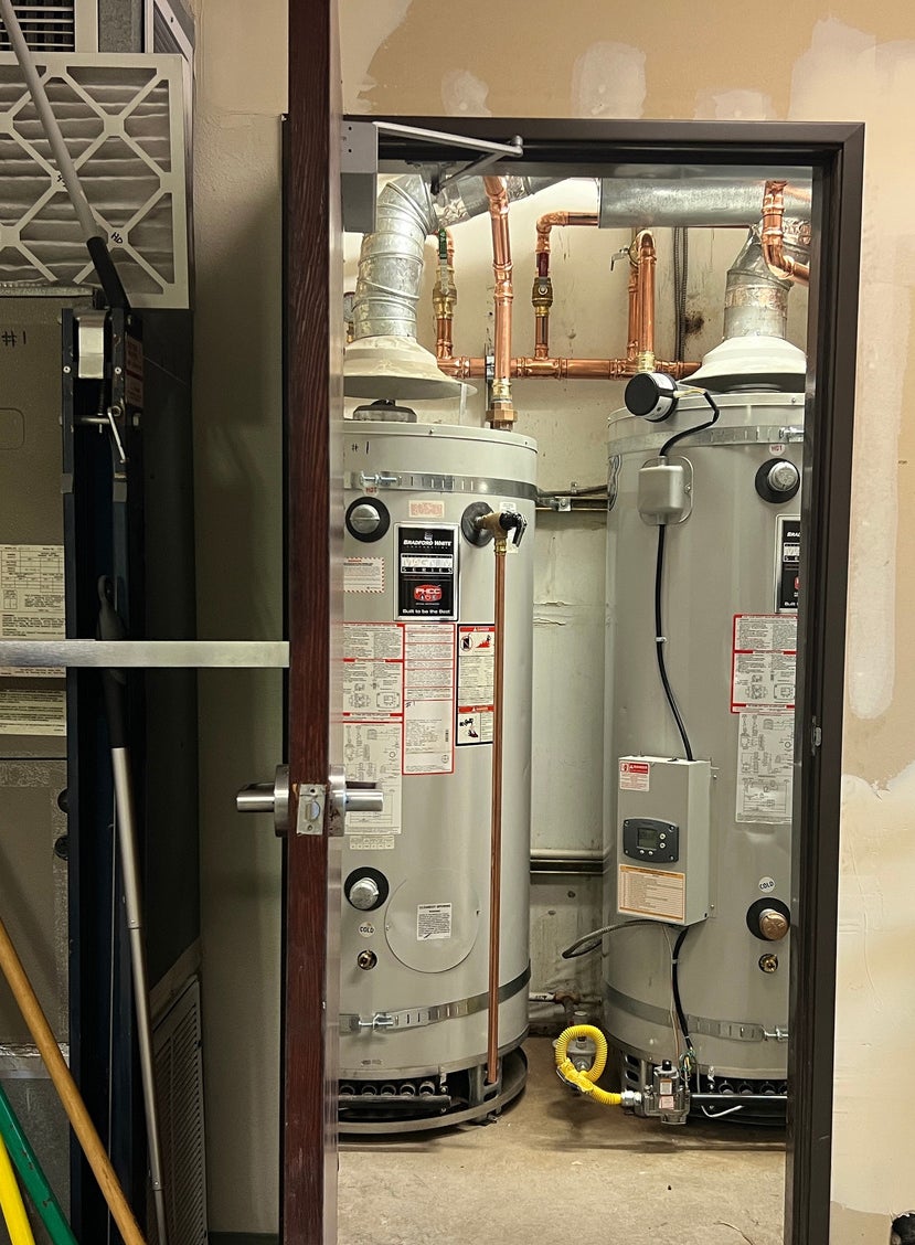 In the dual-fuel configuration, an electric heat pump, two tank gas water heaters, and a storage tank operate in tandem. While the system can run each fuel independently, it achieves the best results when configured to use both strategically.